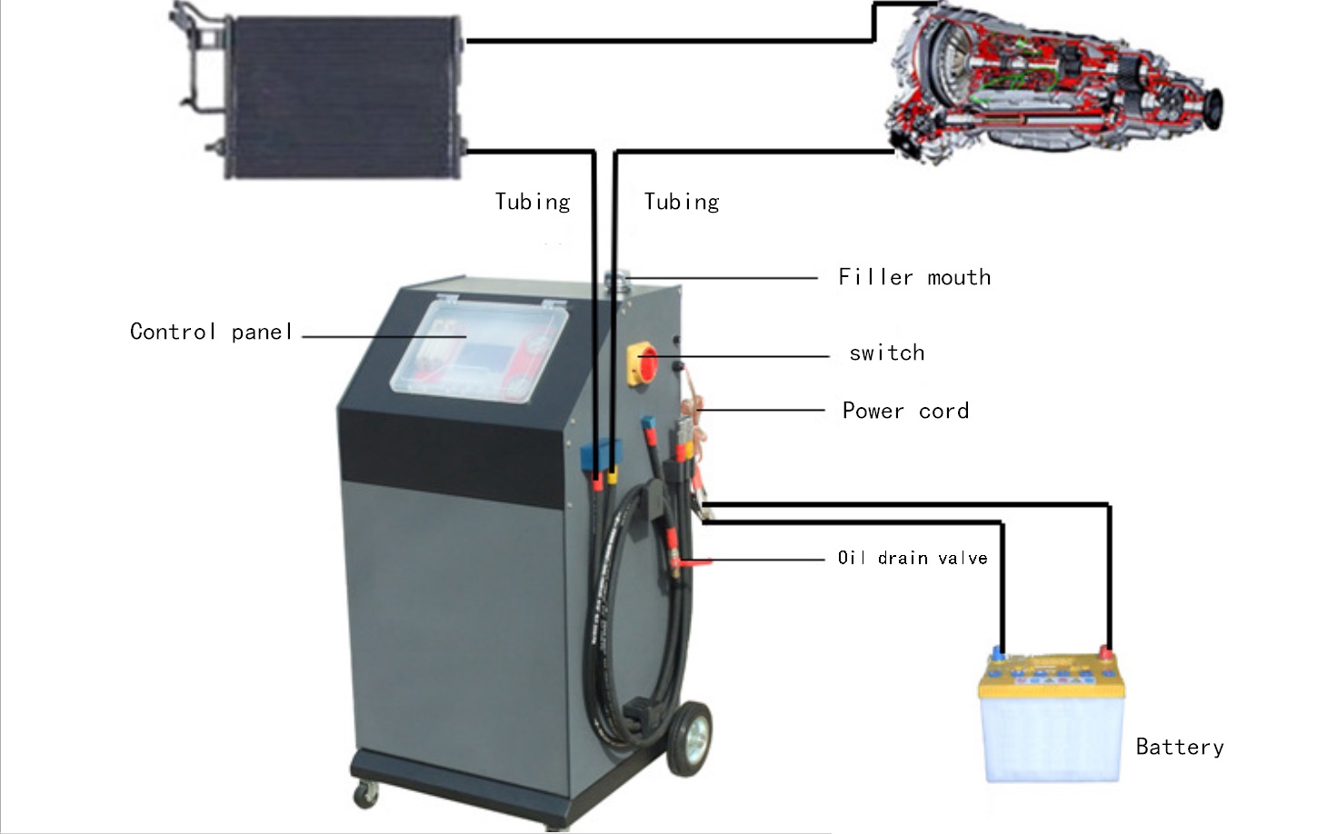 The automatic transmission is used for a long time, and the internal transmission oil will deteriorate. If the automatic transmission oil is not changed in time, the gearbox will work abnormally. Only a simple replacement of transmission oil, but also the need to automatically disassemble multiple parts of the gearbox, and a long time of natural oil discharge, so as to maximize the discharge of old oil, this way time-consuming. In the past, automatic transmission oil replacement machines were generally unable to control the amount of transmission oil as required. Sometimes the gearbox was damaged because of excessive or insufficient filling. This machine can complete the cleaning, the hydraulic torque converter, the transmission box radiator cleaning and the oil change in 20 minutes, the oil change rate is close to 100%.
